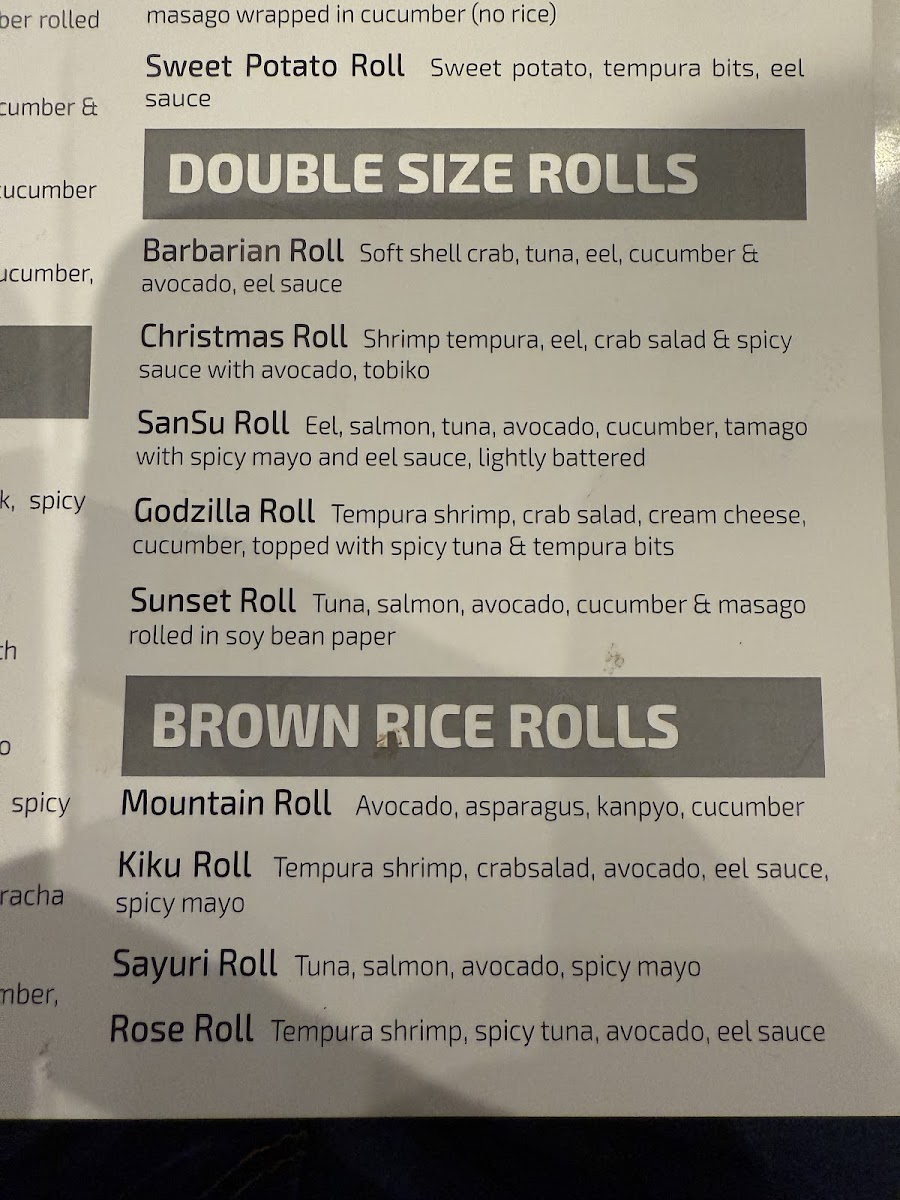 Soft shell crab, tuna, eel, cucumber & avocado, eel sauce.
